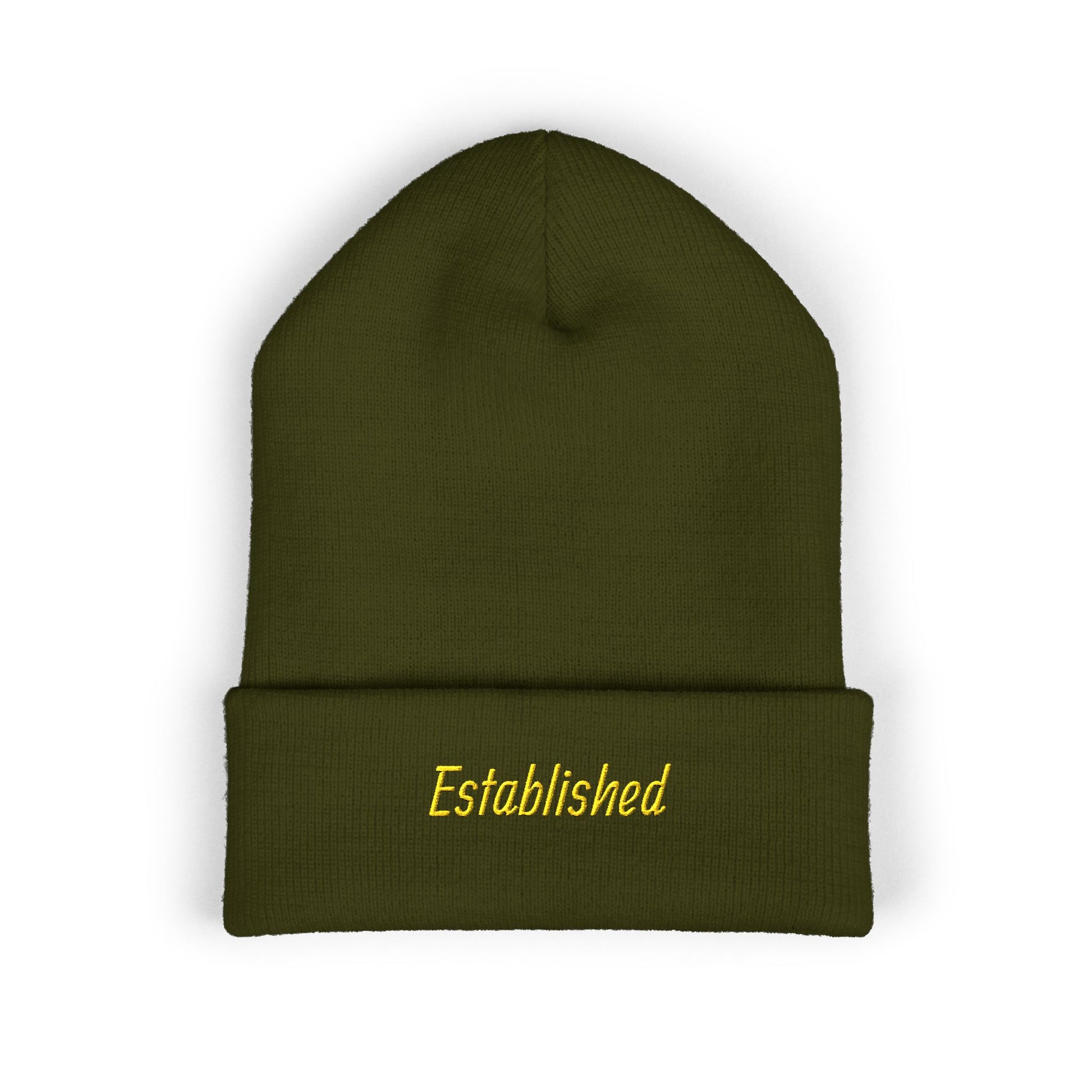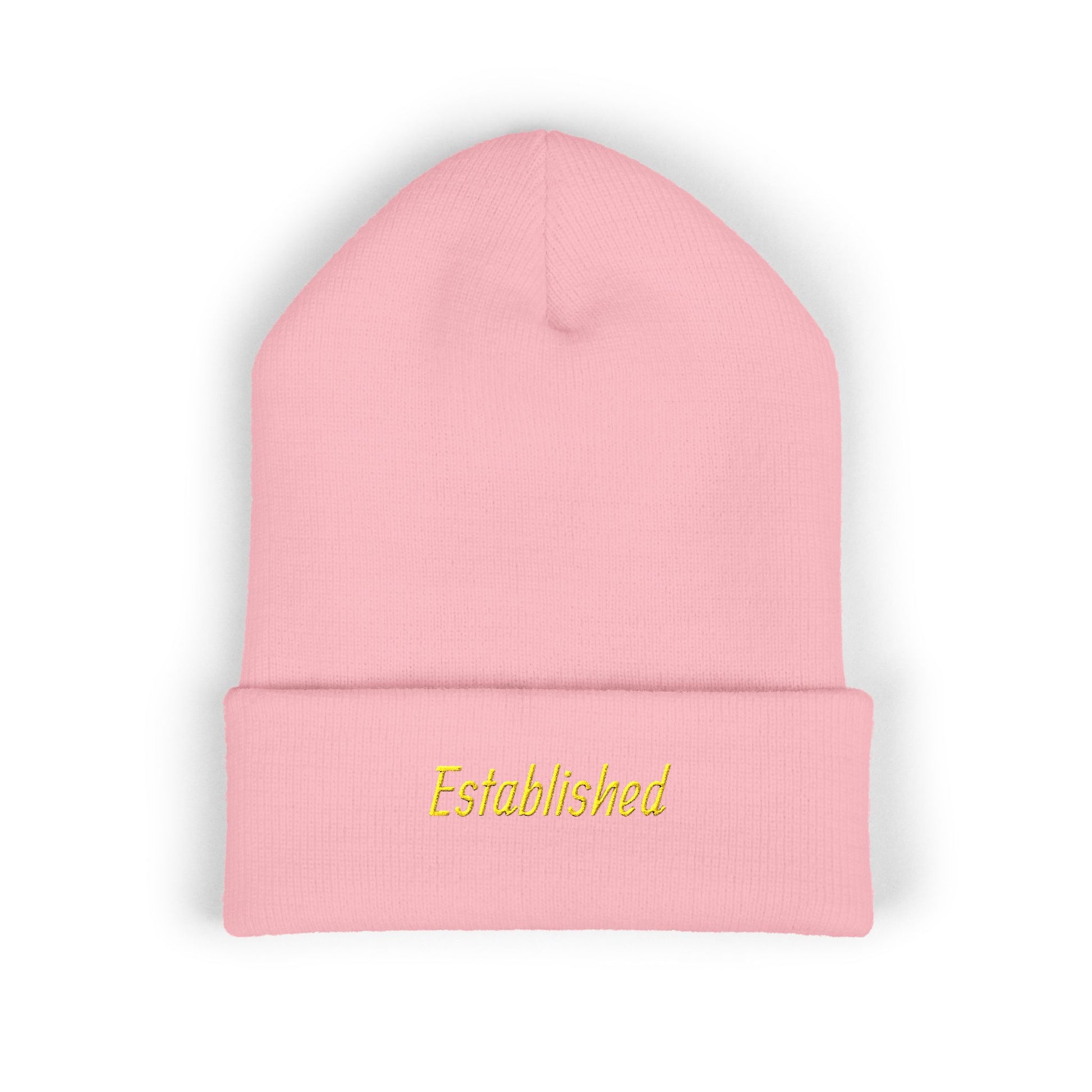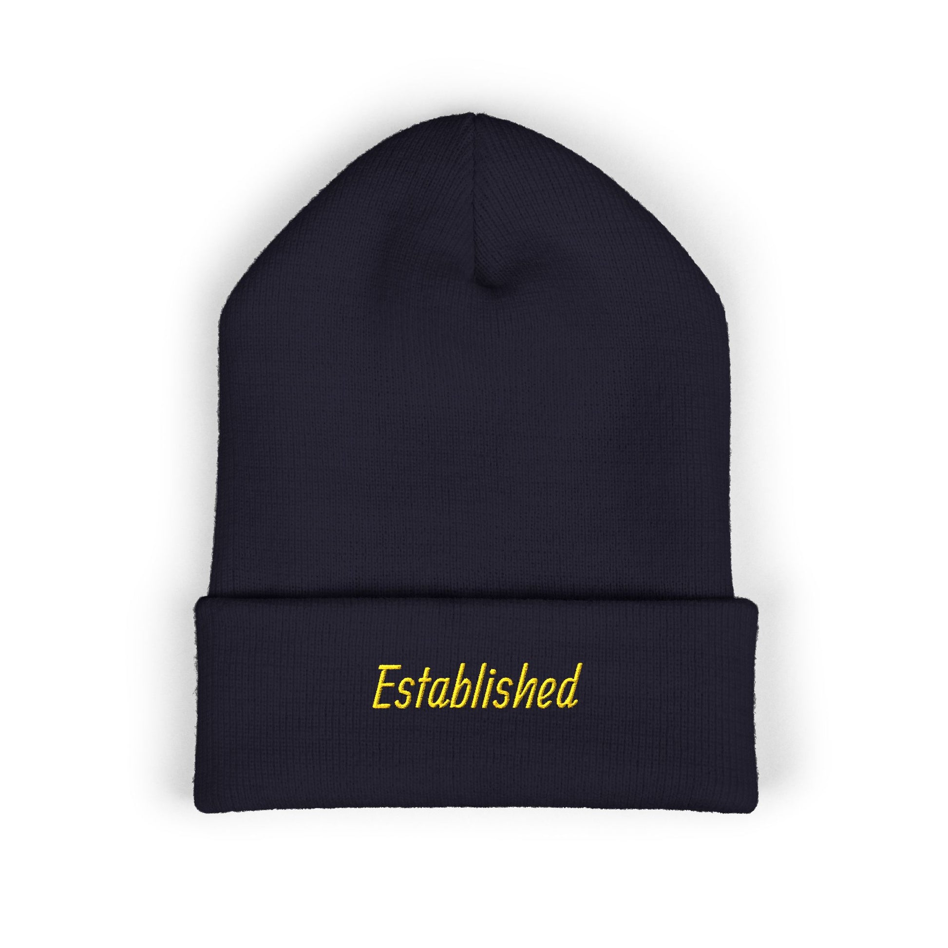 Established Embroidered Cuffed Beanie — Cozy Knit Hat with Script Text